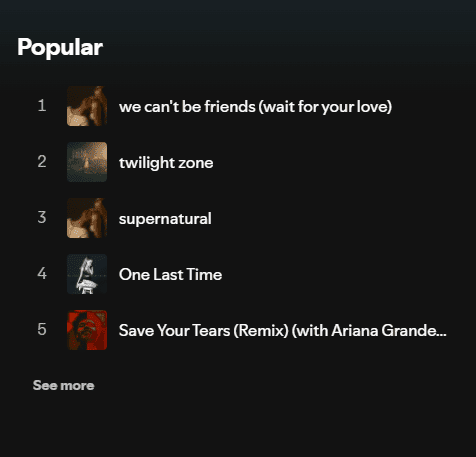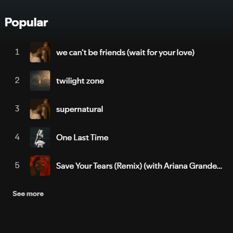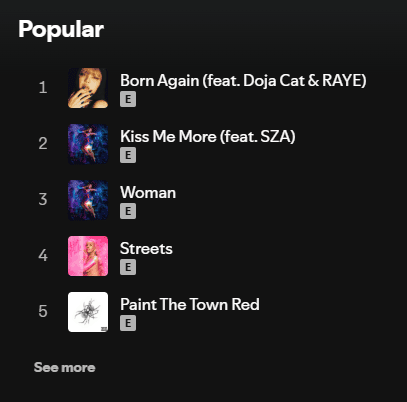 Welcome to the Spotify Popular Songs Artist Recognition Challenge! This quiz will show you screenshots of the top five most popular songs of an artist on Spotify. Your task is to guess which singer these songs belong to. Only true music lovers familiar with current hits can ace this quiz. Test your music knowledge and see how many stars you can recognize!